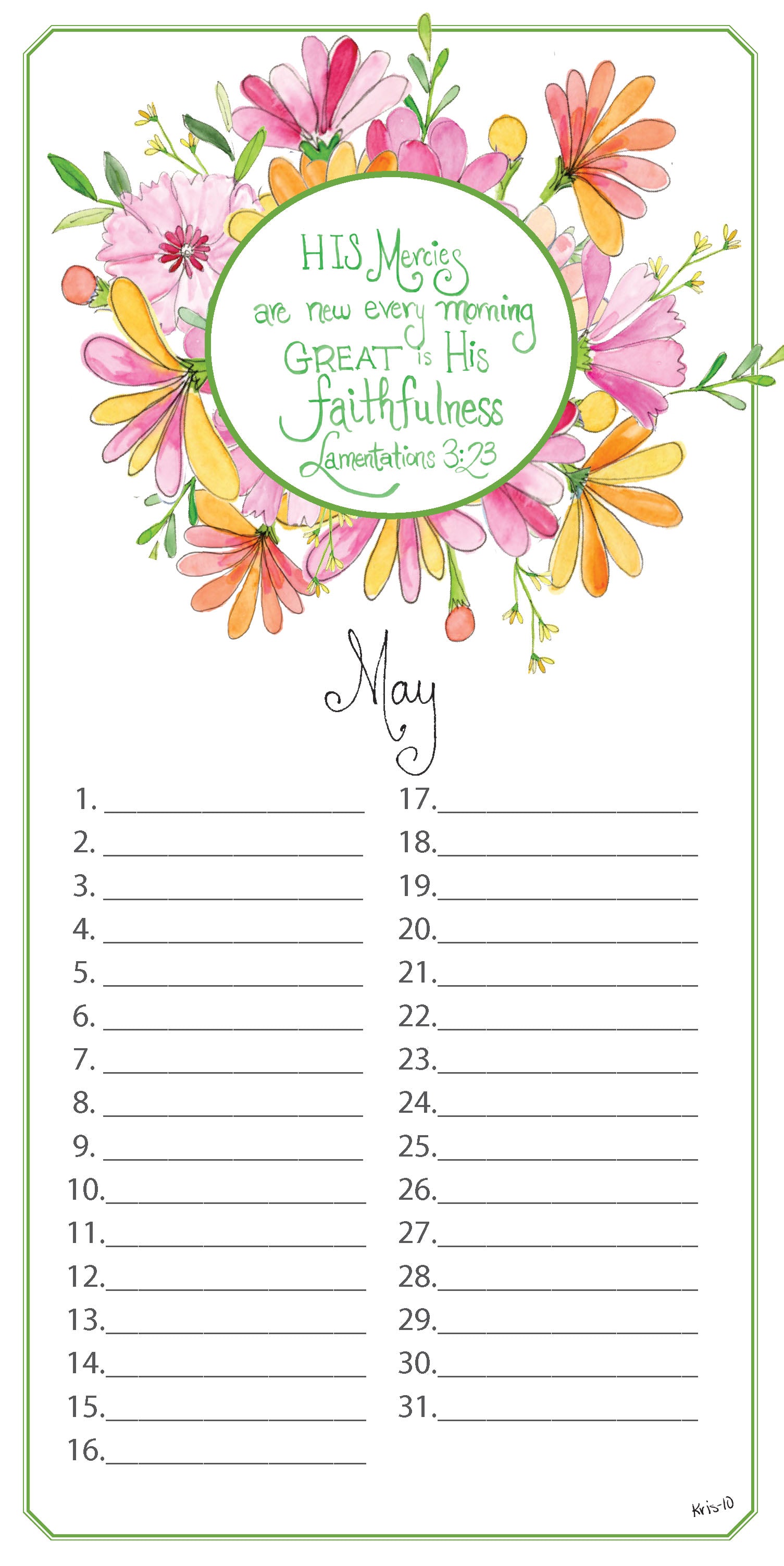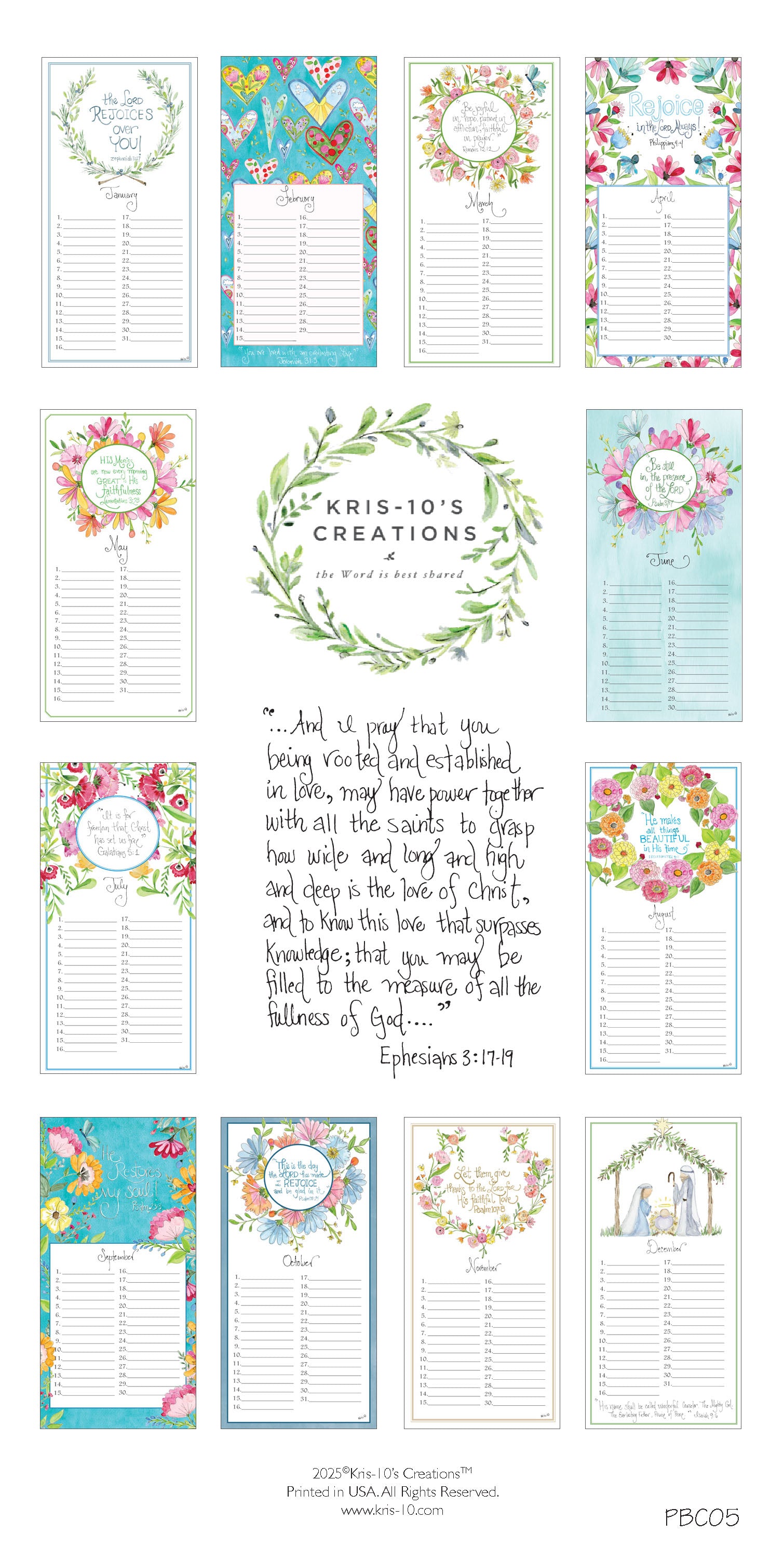 A perpetual calendar to remind you of birthdays and special anniversaries of those that are special to you. Features encouraging Scriptures and hand-painted floral illustrations.