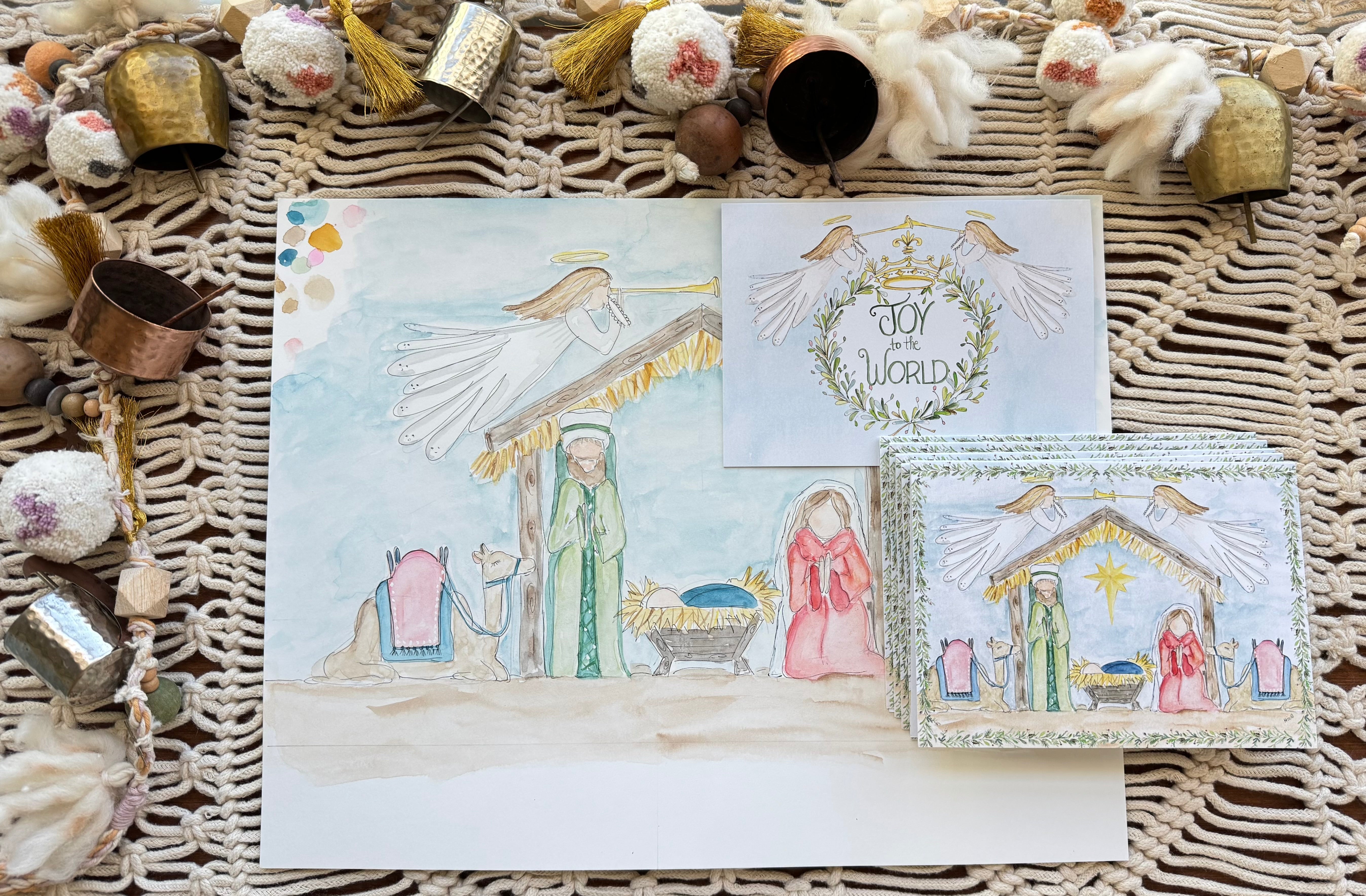 These Bright Nativity Christmas cards feature hand-painted illustrations.